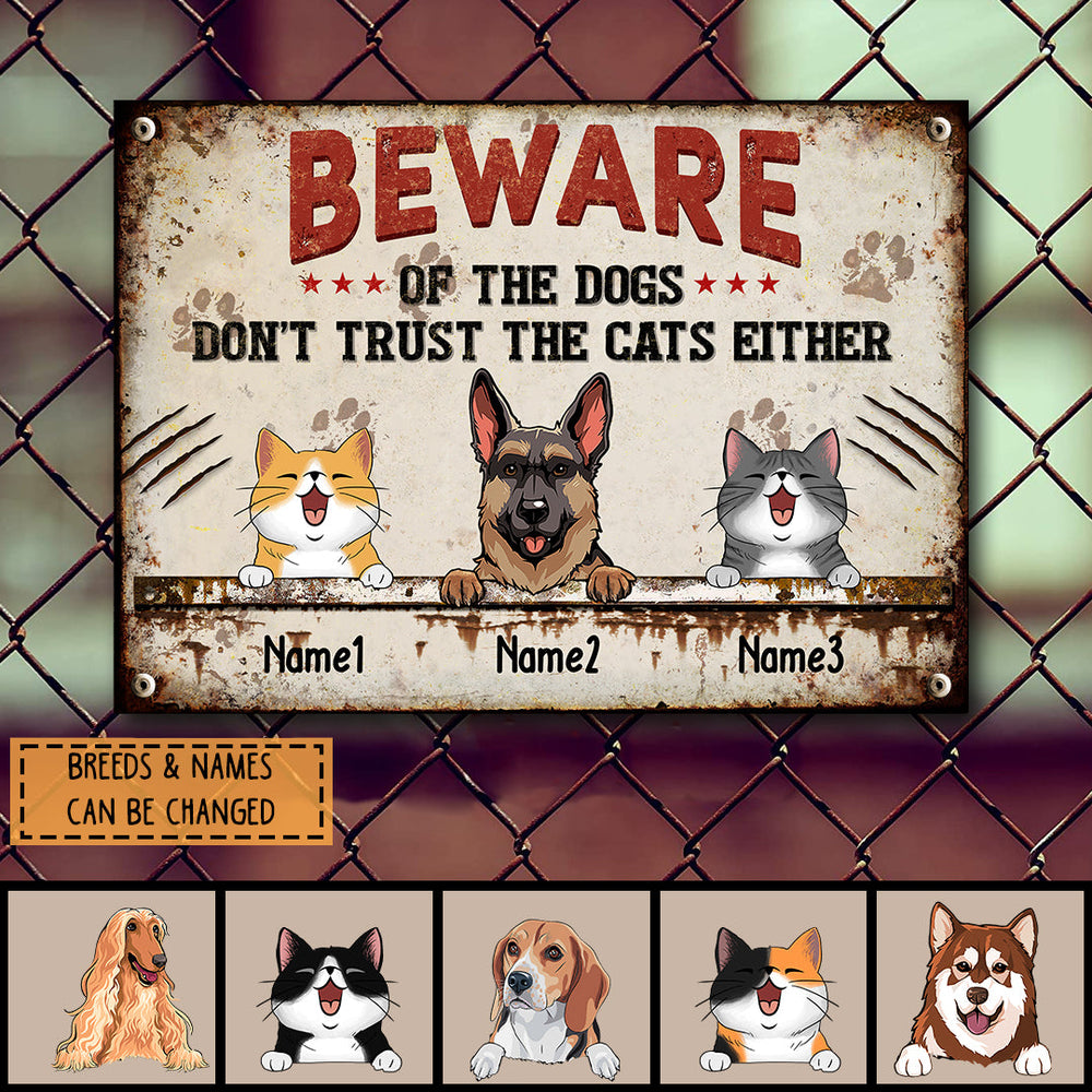 Beware Of The Dog Don't Trust The Cat Either, Personalized Dog & Cat Metal Sign, Gifts For Pet Lovers, Outdoor Decor