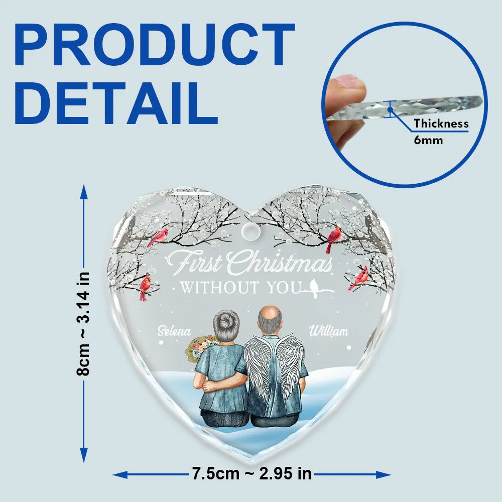 Honor a cherished memory with the Memorial First Christmas Without You - Personalized Heart Shaped Glass Ornament. This heartfelt ornament is a touching way to remember loved ones during special occasions. Perfect as a Gift For Couples, Old Couple, Husband, Wife, moms, dads, boyfriends, and girlfriends on Valentine's Day, Mother's Day, Father's Day, Thanksgiving, Christmas, birthdays, and anniversaries, it adds a meaningful touch to your holiday celebrations.