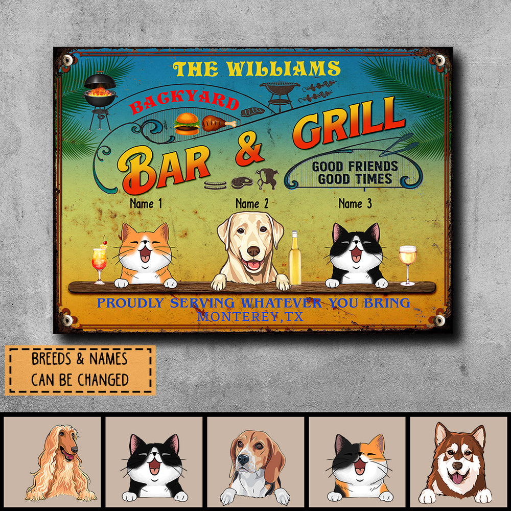 Metal Backyard Bar & Grill Signs, Gifts For Pet Lovers, Proudly Serving Whatever You Bring Personalized Family Sign